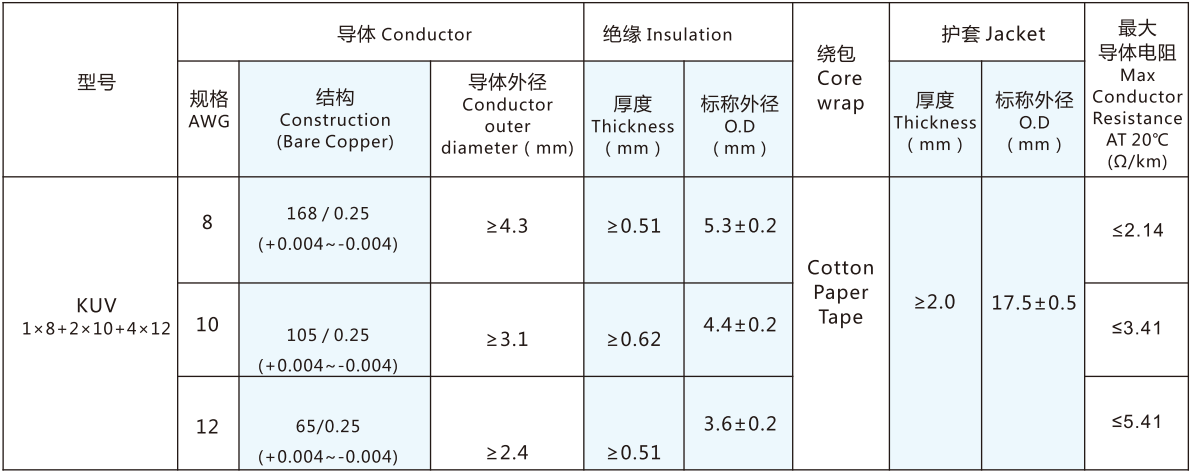 導(dǎo)體采用絞合12-8AWG裸銅絲