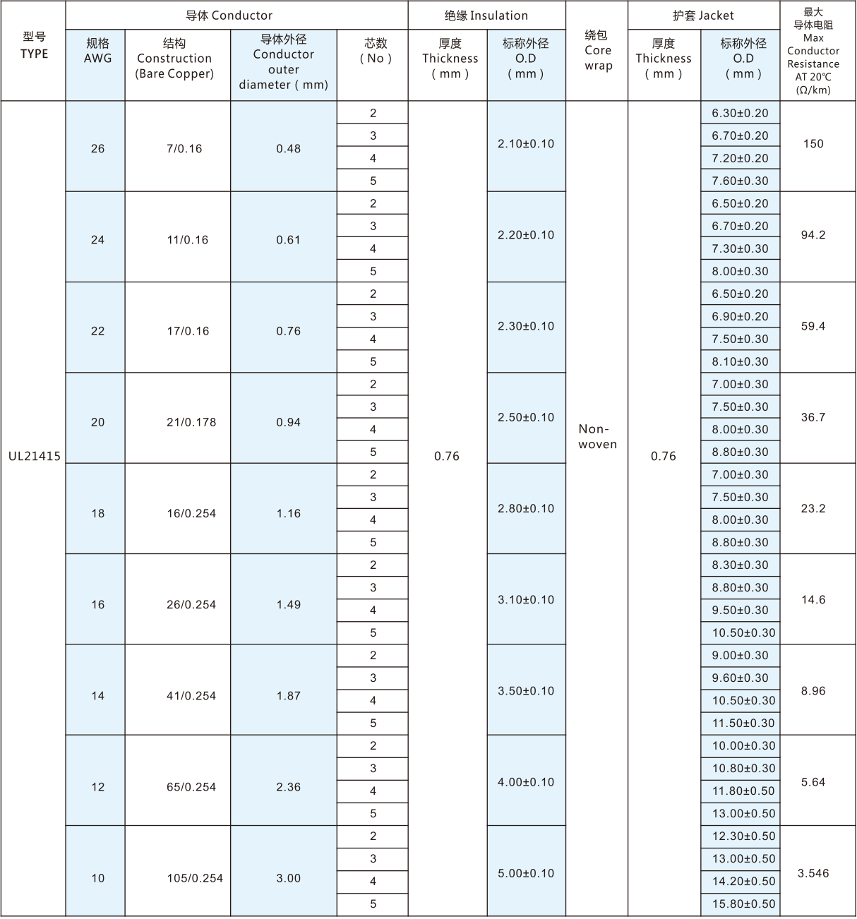 導(dǎo)體采用單根或絞合30-4/0AWG鍍錫或裸銅絲